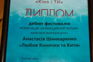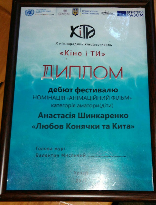 Анастасія Шинкаренко з дитячої анімаційної студії «Крок» перемогла у спеціальній номінації: Категорія аматори (діти) - Дебют фестивалю!