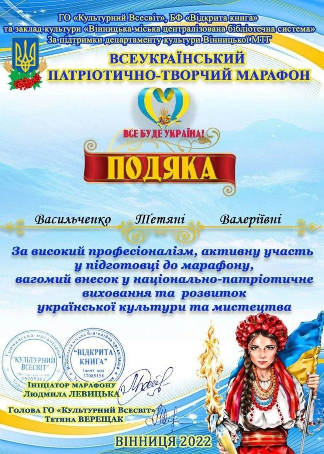 Адміністрація закладу дякує Тетяні Валеріївні за її життєву позицію, сумлінне відношення до роботи, педагогічну майстерність, активну участь у підготовці до марафону та вагомий внесок у моральне та національно-патріотичне виховання підростаючого покоління.