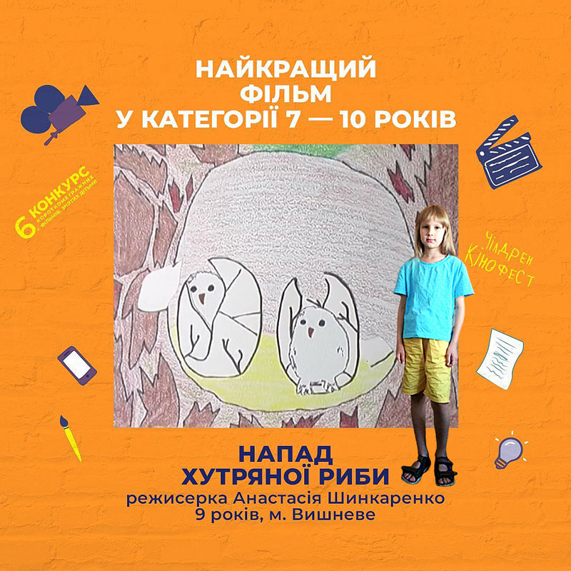 У номінації "Найкращий фільм у категорії 7—10 років" перемогла анімація «Напад хутряної риби» про двох совенят, яких неочікуваний друг урятував із біди. Цей мультфільм 9-річна режисерка з м. Вишневе Анастасія Шинкаренко зняла у нашій мультстудії "Крок". Ася отримала Диплом переможця, приз та нагороду 4 тисячі гривень.